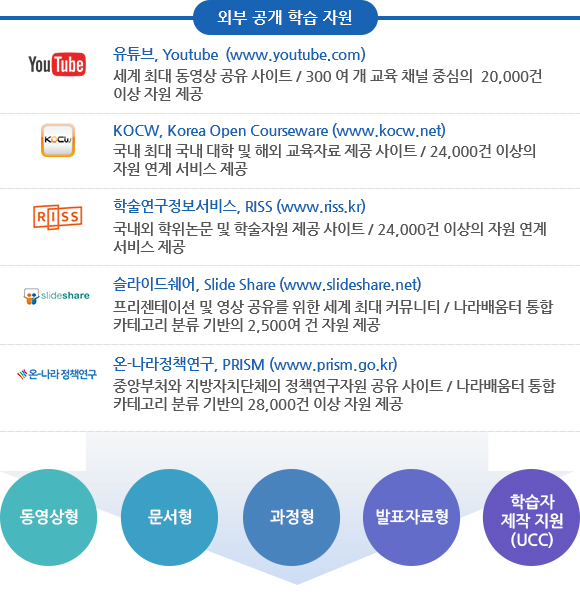 국내 교육기관 및 해외 콘텐츠 공유 사이트와의 협약·연계를 통해 양질의 우수 공개 강좌와 자료를 한 곳에 모아 제공합니다.